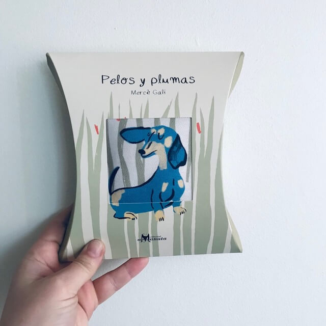Este libro de tela muestra a ocho animales que botan pelos o plumas, entre ellos, un perro y un ganso.