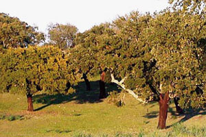 Abundan los árboles y arbustos perennes, con hojas pequeñas y a menudo cubiertas de vellosidades para evitar la pérdida de agua. Las especies dominantes son la Encina (Quercus ilex), el Alcornoque (Quercus suber) y el Quejigo (Quercus faginea). El sotobosque es de tipo leñoso, espinoso y aromático, con especies perennifolias como el Lentisco (Pistacia lenticus), el Romero (Rosmarinus officinalis), el Tomillo (Thymus vulgaris), entre otros.