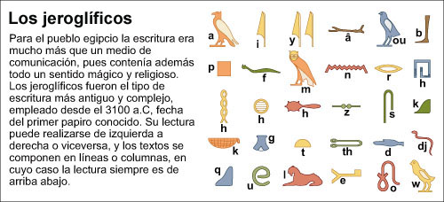 El estudio de los jeroglíficos determinó que podían dividirse en dos categorías: signos con un valor pictórico, llamados ideogramas, y signos con valor fonético, denominados fonogramas.
